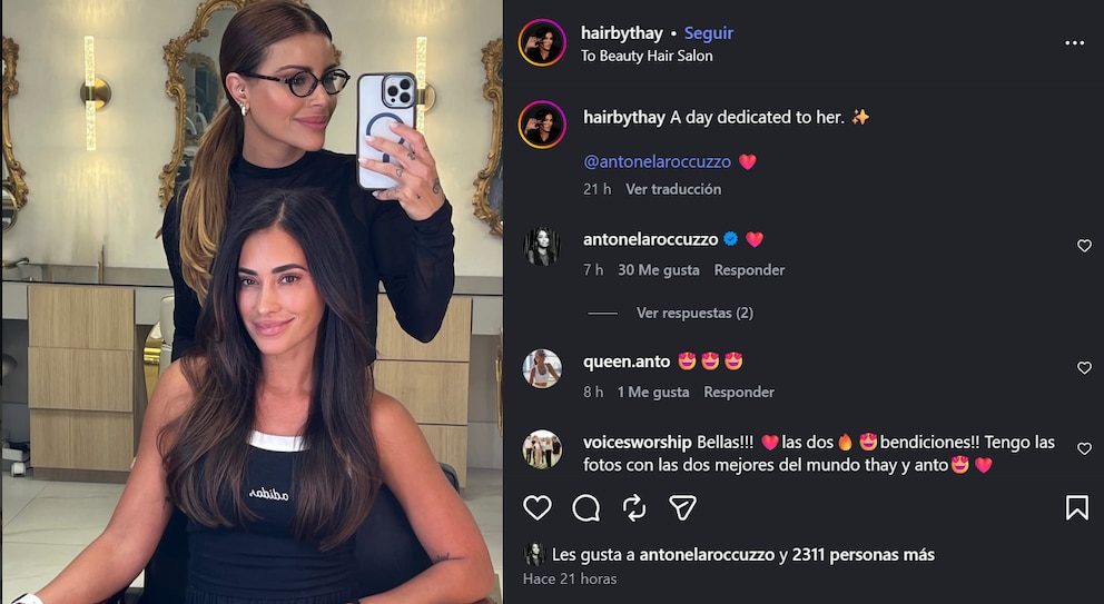 El toque final fue un movimiento suave en las puntas, logrando el efecto blow out inspirado en los años 90 que enfatizó las capas y el volumen sin perder naturalidad. “Un día dedicado a ella”, escribió Thay Oliveira en el posteo, que rápidamente se llenó de likes y comentarios. Antonela respondió con un corazón, mientras los usuarios la llenaron de elogios: “Reina”, “Perfecta” y “Sos la más linda” fueron algunos de los mensajes que se repitieron.