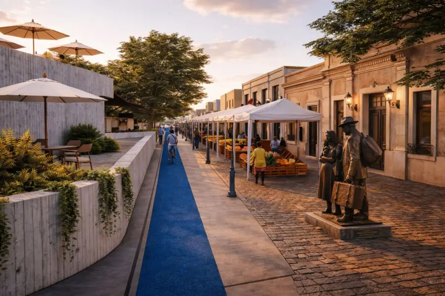 El plan incluye la recuperación de la plaza La Madrid como espacio público central y la reorganización de 152 puestos de venta bajo la estructura de los hangares de la ex terminal, con un diseño arquitectónico unificado acorde a los techos inclinados originales que deberán ser restaurados. Ese sector se proyecta como un “Paseo Popular” con oferta gastronómica. En el mismo esquema se prevé instalar un bodegón en una esquina con vista al parque 9 de Julio, con la intención de promover un corredor gastronómico y turístico.